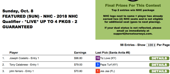 The other available NHC package in this 2-seat-guaranteed event went to Tony Calabrese who spotted his entry wisely. His score of $79.00 got him second in the $165 qualifier. Had he instead played the same horses in the Super Qualifier for $1,000, he would have finished second to Seeman and not won anything.