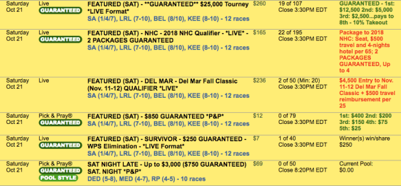 We’ll also host a Saturday qualifier (live-format) for the fast-approaching Del Mar Fall Classic on November 11-12, the weekend after Breeders’ Cup. One entry in 25—at $236 each—will earn a $5,000 package.