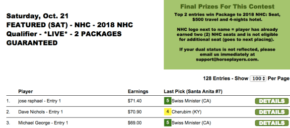Jose Raphael will happily take it, though. And deservedly so. He had Swiss Minister in the last contest race (the 7th at Santa Anita) to vault into first place and win that NHC seat. Dave Nichols also won a seat, finishing just 50 cents behind Raphael.