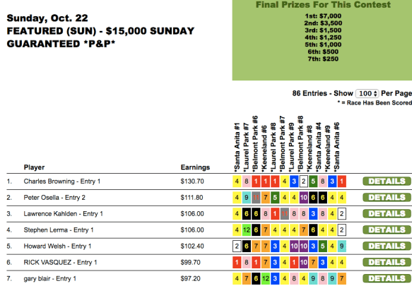 Ernest Hey Jr. made like Pine Tree Lane out of the starting gate and hit five of the first six races to open up an insurmountable lead and romp home first. With only one exception, his winners were not chalky either—6-5, 4-1, 8-1, 32-1 and 5-1. His score of $140.20, compiled in just 10 races, was higher than anyone else managed this weekend in 12. In this tourney, he finished $42.40 of his nearest pursuer. Fortunately for Lawrence Kahlden—who WAS that nearest pursuer—this was a two-seat qualifier so Hey and Kahlden each won $10,000 entries.