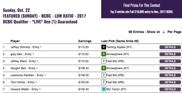 Congratulations to Trezza and to his fellow winners Robert Traynor (1st) and George Chute (3rd…and also 3rd in the $25K) in this HorsePlayers BCBC Super Qualifier. And check out those margins between the top three. It was like an off-the-turf race in the slop at Belmont. Larry, Moe and Curly could have been the placing judges for this one.