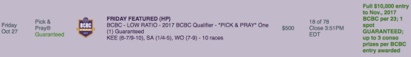 Then there’s our always-popular $6,000 Guaranteed Pick & Pray with pool-style payoffs that could mean a total prize pool of as much as $10,000 depending on how many entries are attracted. But it will be worth at least $6,000 no matter how few participate, so this might be a good one to monitor closely in case other players are “resting.” The entry fee is $190.