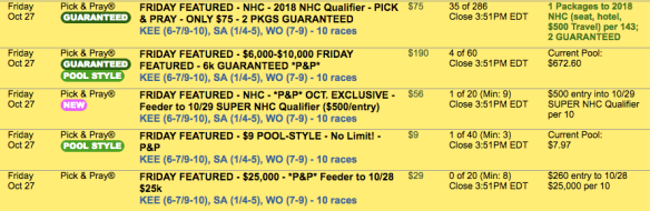 Cash game lovers will surely target our $15,000 Guaranteed Pick & Pray with $7,000 to the winner and payouts down to 7th. Entry is $195 with a limit of 86 entries. Again, on the weekend before a big weekend like Breeders’ Cup, pay extra attention to any tournament marked “Guaranteed.” Doing so could be beneficial to your bankroll.