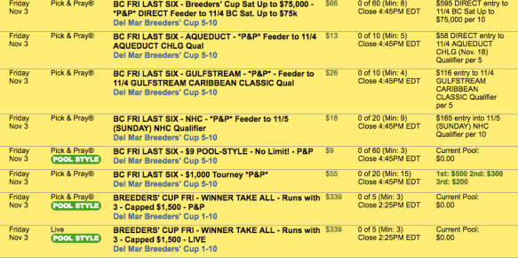 Perhaps our $15,000 Guaranteed game serves as a nice inducement. Frankly, I think the HorseTourneys bean counters might be a little bit foolish offering a guaranteed pot of that size on the day after Breeders’ Cup. But as Peter Marshall liked to say on Hollywood Squares after someone made a dumb move, “This may work out for you.” In this case, the “you” is you.