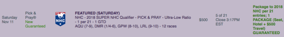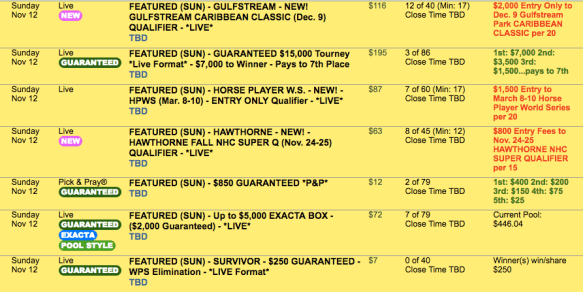 But it will be worth at least $6,000 no matter how many participate, so this might be a good one to check out in case other players are sleeping off the Breeders’ Cup. The entry fee is $190, and entries are capped at 60.