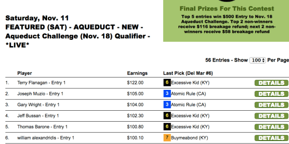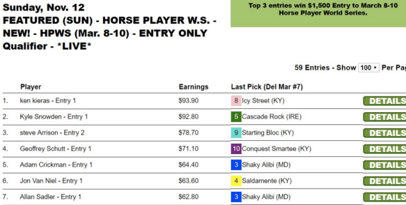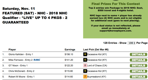 The first two of those were claimed by Edward Osterhout and Joseph Costello in Friday’s $75 qualifier at HorsePlayers. Both Osterhout and Costello cashed in the last race, and it was a good thing. Osterhout had the 3-2 winner and Costello caught a $6.60 place payout. Those collections, respectively, allowed each to preserve their positions and safeguard their NHC spots from a slew of would-be leapfroggers.