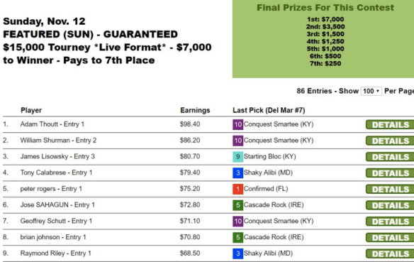 Story may someday thank Greyvitos for the memories of playing in the 2018 NHC. Greyvitos ($41.80, $9.20) added $51.00 to Story’s score following his win in the Bob Hope Stakes. Story blanked on the last race, and then had to sweat out the parimutuel payoffs when Anthony Trezza’s selection of 6-1 shot Excessive Kid won the final contest race at Del Mar. Trezza needed $25.00 to tie Story, but the $17.40-$6.60 win/place payoff left Trezza figuratively a day late and literally a dollar short.