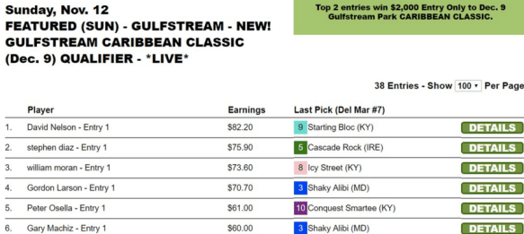 For those looking ahead to upcoming weeks, note that we have a $100,000 tourney ($70,000 Guaranteed) now slated for Saturday, December 2. And starting this Saturday we begin offering full-package Horse Player World Series qualifiers each week (on Saturdays, with entry-only games offered on Sundays). And we also kick off qualifiers to Surfside this coming weekend.