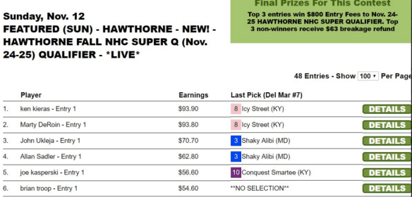 And despite the fact that our Hawthorne qualifier was also a live-format tourney, Kieras just copied his HPWS picks over to his Hawthorne entry and won that as well with the same score of $93.90.