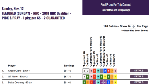 Three more NHC seats were awarded on Saturday. In the Super Qualifier at HorsePlayers, Frank Story prevailed by a buck over Anthony Trezza.
