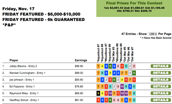 Jobby Blevins rocketed out of the gate like Pine Tree Lane (she was a bullet for the first 100 yards) with winners right off the bat at 17-1 and 8-1. Similar to Pine Tree Lane, Blevins couldn’t keep up that pace for the whole race. But he bottomed out the field and held on late to earn the winner’s share of $3,951.53 in a pool-style game that had a final purse of more than $7,900. I don’t think runner-up Randall Cunningham is the UNLV guy who used to scramble around for the Eagles and Vikings. Nor do I think 3rd-place finisher Joe Johnson is the guy who fired up threes for the Hawks and Nets. I also don’t think those pro athletes can handicap as well as our two.