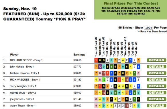 Richard Grose had a nice final score of $98.50, but he needed Edwards Going Left ($6.60, $4.00) in the contest nightcap, the 8th at Del Mar to put him over the top. The suspense was worth it for Grose, though. He won $7,377.