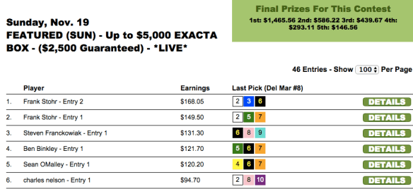 That’s right. Frank Stohr completed the exacta in our Exacta tourney all by himself. So, between first and second money, Stohr scooped $2,051.78 out of the available $2,931. Steven Franckowiak was third.