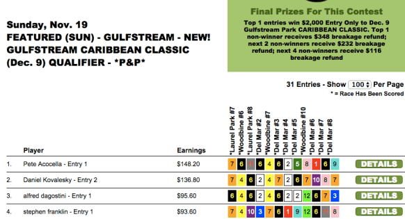 There…now that’s better. On a chalky day when high scores were difficult to build, Van Niel scoped out winner after winner. Eight in all, including the “late pick three.” And one place horse for good measure. If it weren’t for Laurel races, he might have swept the card! Well done, Jon. (And you too, John and John.)