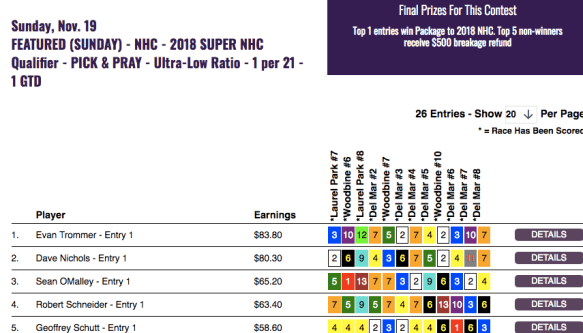 Last but not least, our NHC Super Qualifier Pick & Pray at HorsePlayers went to Evan Trommer.