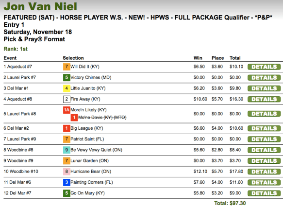 Saturday was also the day of our first full-package qualifier to the Horse Player World Series. This contest wasn’t as close as most this weekend. And that was because of a dominating performance by Jon Van Niel.