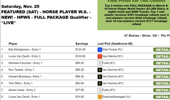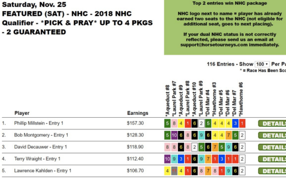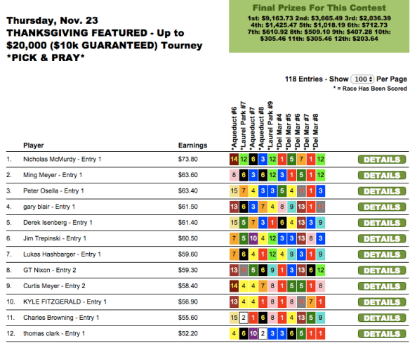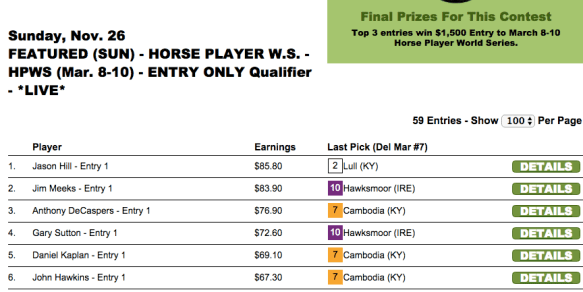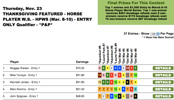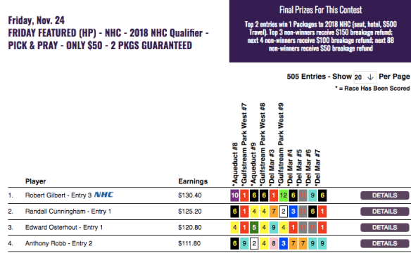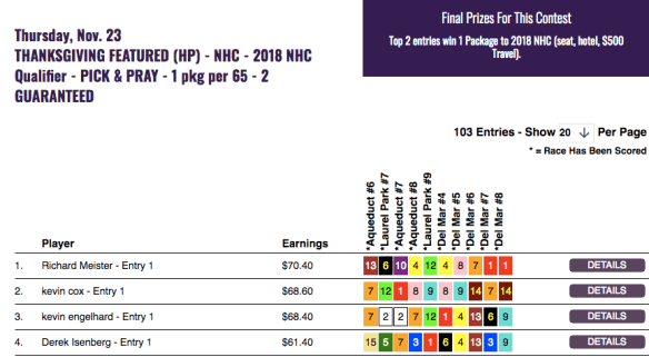 In Thanksgiving Day’s NHC qualifier at HorsePlayer, winner Richard Meister was another who seemed to subscribe to the “Fill up early in case they run out of food” philosophy. He hit three of the first five races to win his seat. But he wasn’t the most finicky eater at this particular table.