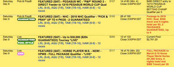 Contest races for all of Saturday’s featured tourneys are the 6th through 8th (all stakes) at Laurel Park; the 7th and 9th from Aqueduct; the 7th, 9th and 10th from Tampa Bay Downs; and the 6th through 9th at Hawthorne.