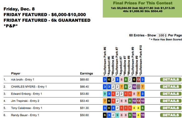 Broth came to a quick early boil by hitting five winners out of the first six races in our sold-out $10,000 Pick & Pray on Friday. His final four picks were strictly back-burner material. But early wins count every bit as much as late ones, and Broth prevailed in the quest for top money of $5,044.50.