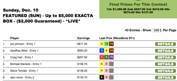 In our other featured Sunday cash game, the $2,000 Guaranteed Exacta tourney, it would be an understatement to say things came down to the last race.