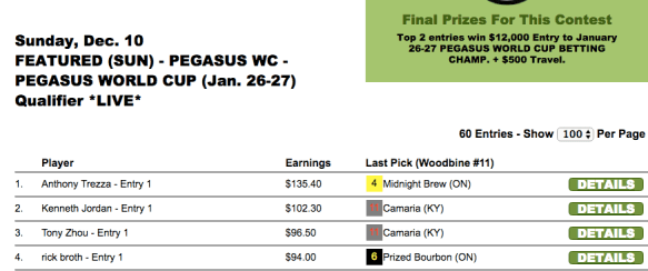 The weather was better on Sunday, and the day marked the return of our Pegasus World Cup Betting Championship qualifier. And what a qualifier it was.
