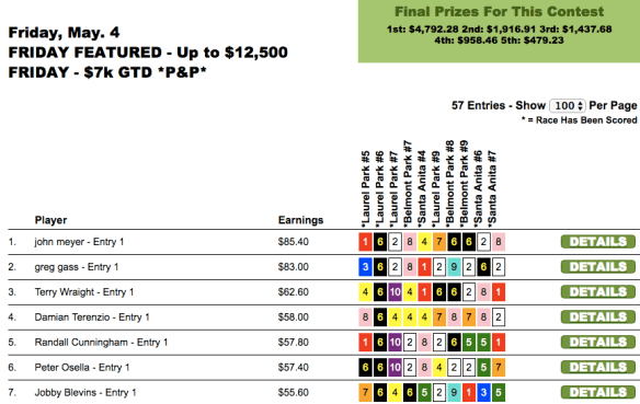 John Meyer had both of those “giant for this day” winners. And he added a couple of other winners and runners up to eke out the top prize of $4,792 over Greg Gass ($1,916). Five of Meyer’s six contest collections came in the first six races, which kept Meyer on or near the lead the whole way. It’s always a little less nervewracking to win tourneys that way!