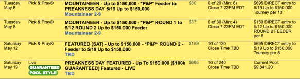 So that was Derby weekend (minus the Derby) at HorseTourneys. You won’t have to worry about a Preakness weekend without the Preakness, though. The middle jewel of the Triple Crown will be the highlight of a large menu of tourneys, including a special up-to-$150,000 event.