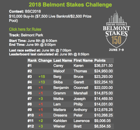Congratulations to Karen Carey, winner of the 2018 Belmont Stakes Challenge. Carey keeps her final bankroll total of $36,571.50 plus she earned a bonus of $60,000 for finishing first, an entry into the 2019 Belmont Stakes Challenge, plus her choice of an entry to the Breeders’ Cup Betting Challenge or the NHC.