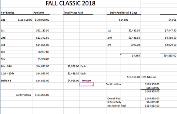 Matties earned $52,132.50 for his triumph, plus an additional $2,482.50 for having the best first-day score. Joe McCoy finished second and received $22,342.50. Tom Blosser was third and won $14,895. Cash prizes were paid to the top 20 finishers and the top three scorers during each individual day of the three-day contest also received cash bonuses.