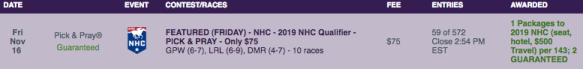 Sunday serves as your next-to-last-chance to win your way into two other events: the Gulfstream Park Conquer the Crown Challenge on their opening day, December 1; and the Lone Star NHC qualifier held on the same day.