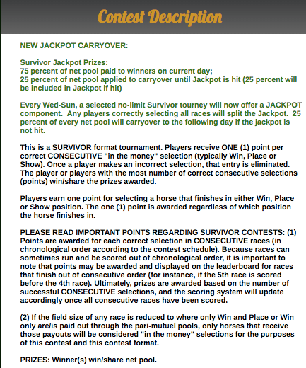 If a given day’s jackpot is not hit (i.e. no one correctly selects a win, place or show finisher in each race of the contest), then the remaining 25 percent of the day’s net pool will carry over to the next Survivor Jackpot game’s carryover pool.