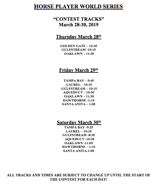 Here are the contest tracks for each day of the upcoming Horse Player World Series (HPWS) to be held March 28-30 at The Orleans in Las Vegas: