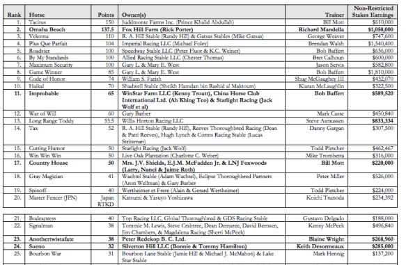 For his distant, third-place finish in Hot Springs, Country House earned 20 points to give him a total of 50. Had he passed the race and stood pat with 30 points, he would have been on the outside looking in, relegated at best to the AE list behind the likes of Bodexpress, Signalman, Anothertwistafate, Sueno and Bourbon War. Instead, he’s a Derby winner.