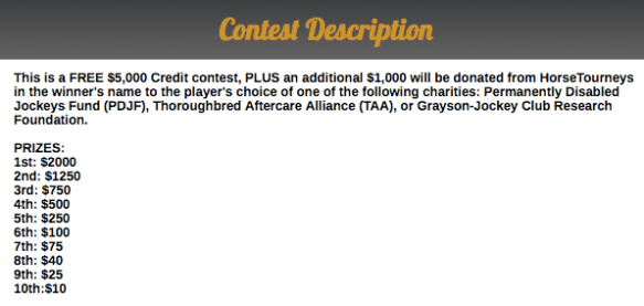 This holiday contest is both a way for us to say “thank you” to our most loyal players, and to raise some money for good, horse racing-related causes. We’ve been running free feeders to the tourney for about 10 days, and now, direct buy-ins are available for $50 each. All proceeds from the buy-ins will be split equally between the Permanently Disabled Jockeys Fund, the Thoroughbred Aftercare Alliance and the Grayson-Jockey Club Research Foundation. The winner will receive a first prize of $2,000 in credits plus an additional $1,000 in cash to be donated in his or her name to one of the above organizations. (In fact, it will actually be a positive-expectation tourney for those buying in if we get fewer than 100 entries.) Payouts will go to the top 10 finishers as follows: