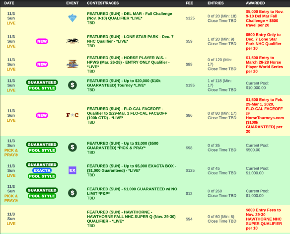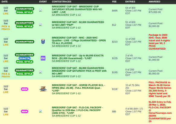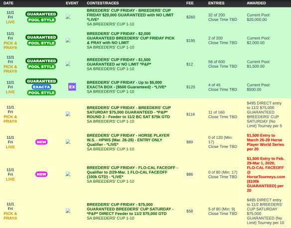 There’s the $20,000 Guaranteed tourney. The $25,000 Guaranteed, two-day, Breeders’ Cup-only game. An up-to-$5,000 Exacta tourney. And qualifiers to the Horse Player World Series and Flo-Cal Faceoff. Plus feeders to the following day’s (Saturday’s) $75,000 Guaranteed tourney.