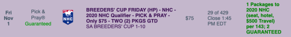 It’s a $75 NHC Pick & Pray with two spots guaranteed. Contest races are the full card (races 1-10) from Santa Anita. In fact, those will be the contest races for all of the Friday featured tourneys.