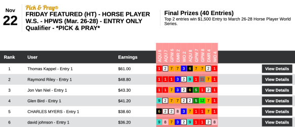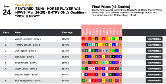 Back at HorseTourneys on Friday, there was an entry-only Horse Player World Series qualifier that wound up offering two $1,500 entries.