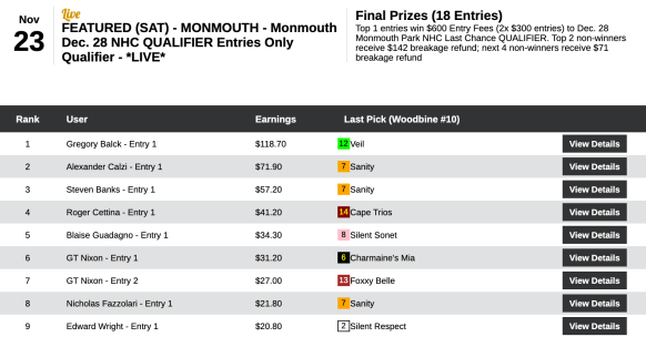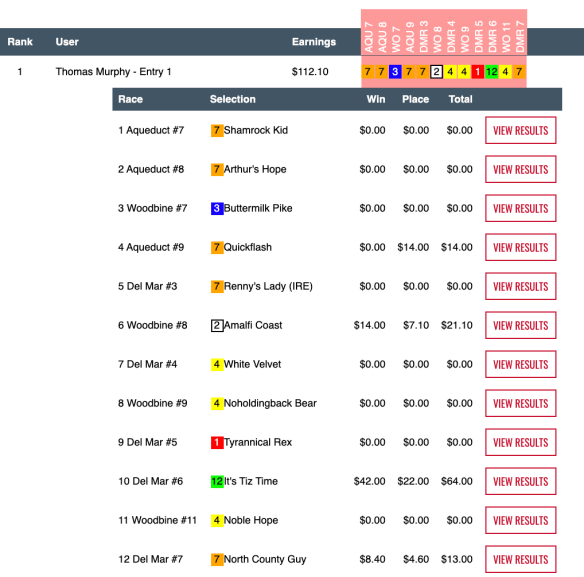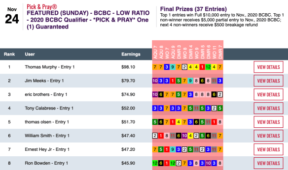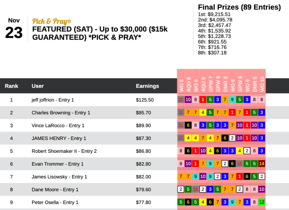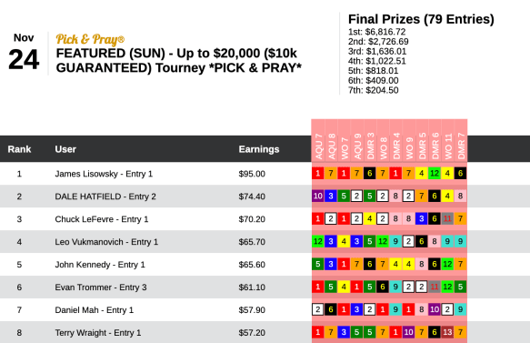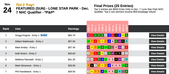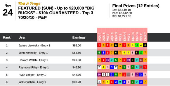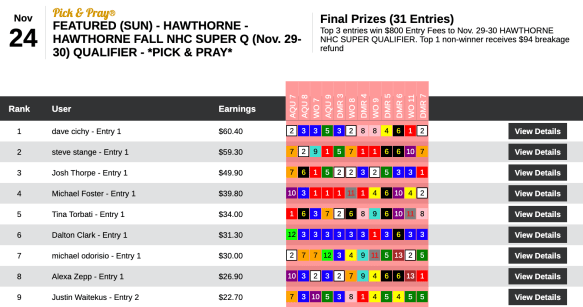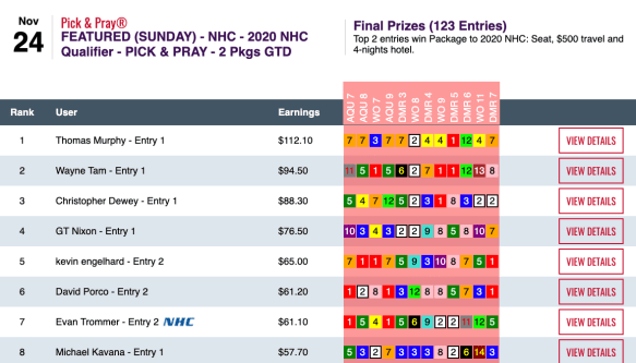 And in actuality, Murphy not only won the regular NHC Pick & Pray on Sunday, he did so with the day’s highest score, drop-kicking his opponents with a total of $112.10, built on three firsts and one second. Here’s a look at his scoresheet: