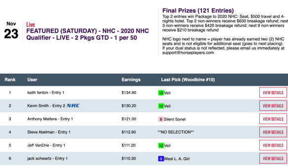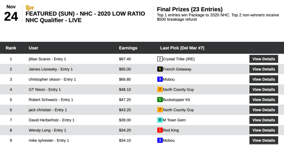 Jim has now won three entries at HorseTourneys to the Horse Player World Series. He still hasn’t qualified to the 2020 NHC, though. That’s only because of Jillian Scanio.