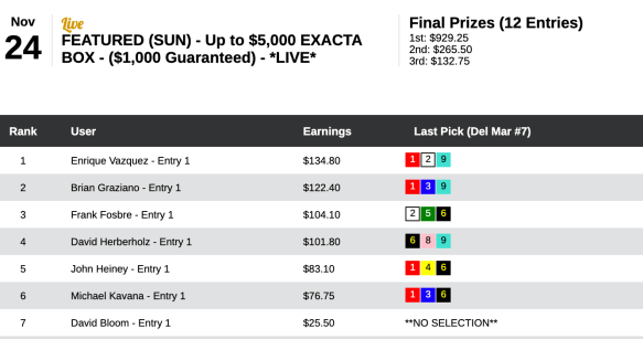 From 12 races in our $1,000 Guaranteed Exacta tourney, Enrique Vasquez connected on five successful gimmicks.