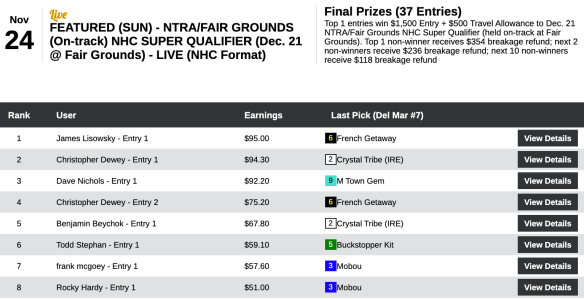 He picked seven winners in winning Friday’s $75 NHC qualifier at HorsePlayers. Rosen was already double-qualified, however, so he was just playing for the Tour points. The first NHC seat went to runner up Robert Courtney…who did Rosen one better.