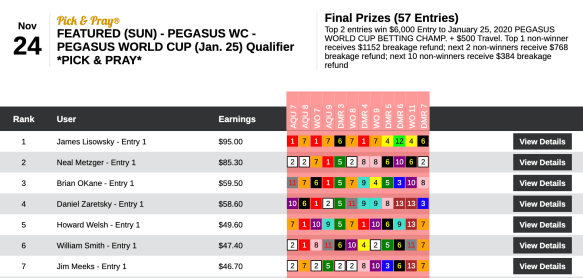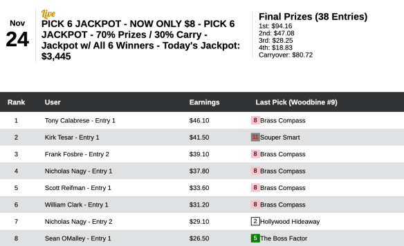 Mark Stillmock has been on a nice run of late. On Friday, he kind of pulled off a “reverse Lisowsky” by tallying just $59.10 but picking six winners. Still that final total was enough to earn Stillmock $5,380 in the day’s $7,500 Guaranteed Pick & Pray, which finished up with a pot of $10,761.