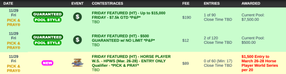 Black Friday is Green Friday at HorseTourneys with our up-to-$15,000 Pick & Pray. It carries an entry fee of $190 and has a guaranteed purse of at least $7,500.
