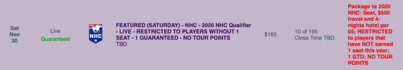 It’s a $165, live-format qualifier that is restricted to those who have yet to win a seat to the 2020 event. This “Maiden Special” guaranteed one spot, and, since the field is restricted, no NHC Tour Points will be available in this one. So go for the gusto!