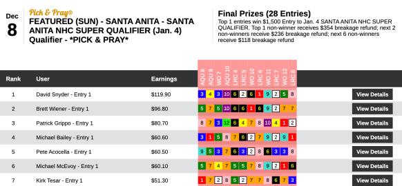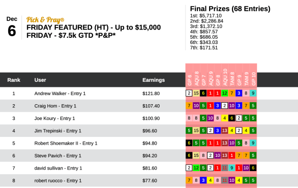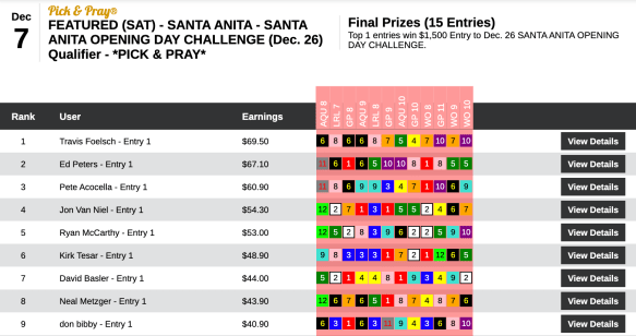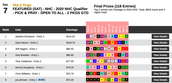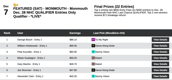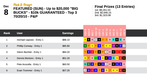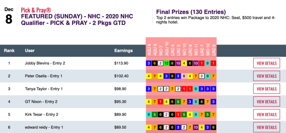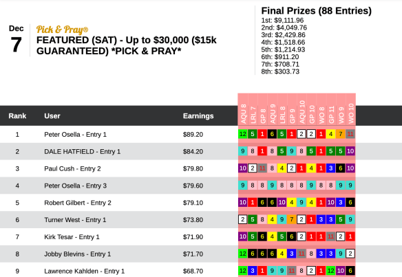 Saturday cash-game star Peter Osella wasn’t just having a good day, he was having a good weekend. Here he caught an $8.00 place horse in the final race to get up into second behind Jobby Blevins in Sunday’s regular NHC Pick & Pray. It should also be noted that on Thanksgiving, Osella also picked up a $6,500 Pegasus entry…so he’s seeing the ball very well right now.