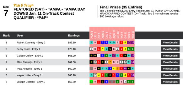 Courtney (2 wins, 4 places) was one of the last horses away, but he cashed in each of the last four races to get up…in the shadow of the wire…over runner up Henry Conte, who also won an Oldsmar, Florida, entry. Should Courtney and Conte arrive at Tampa Bay Downs a day early, we expect that they will find tomorrow’s edition of Daily Racing Form on sale there.