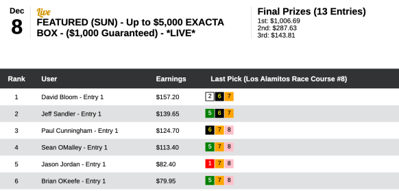 David Bloom took this one with four winners, including an $82.40 hit (for a buck) in the 4th at Los Alamitos and a last-race collection of $21.50 that allowed him to hold the $1,006 first prize safe. The total purse finished at $1,488.