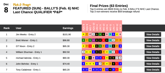 The winners of Sunday’s NHC Last Chance qualifier can nearly fill up a table at Bally’s. There were six of them.