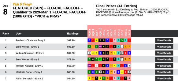 And so can Frederick Cipriano, who bested Wiener by $1.10 to take top honors. Both advance to the $100,000 Guaranteed All-Gulfstream/Santa Anita online competition here at HorseTourneys on February 29 and March 1.