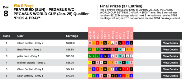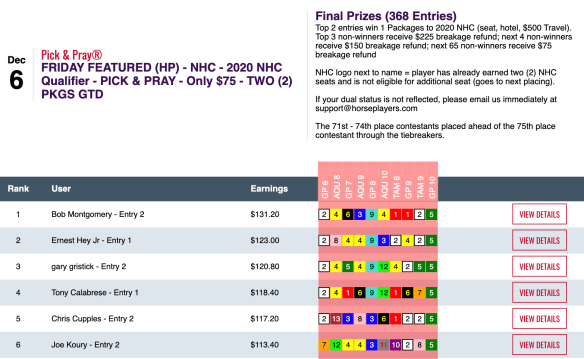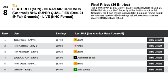 The holiday shopping season is suddenly in full swing (I’m already behind), and so is the contest qualifying season with the NHC and the Pegasus World Cup Betting Championship not too distant on the horizon. Due in no small part to that, we set an unofficial record this weekend with 25 featured tourneys. I have the happy duty, of course, of reporting all the winners—the first five of which came on Friday.